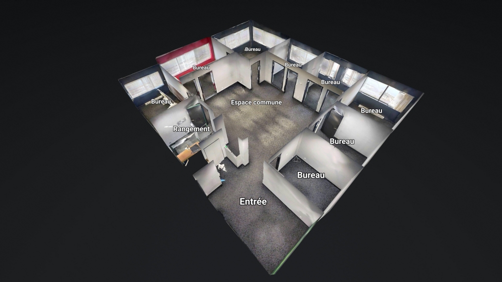 D’une superficie d’environ 2 105 p.c., le local se compose de huit bureaux fermés, d’un grand espace commun central, ainsi que d’un local de rangement. La configuration favorise autant le travail individuel que la collaboration d’équipe, tout en assurant une bonne circulation et une utilisation optimale de l’espace.