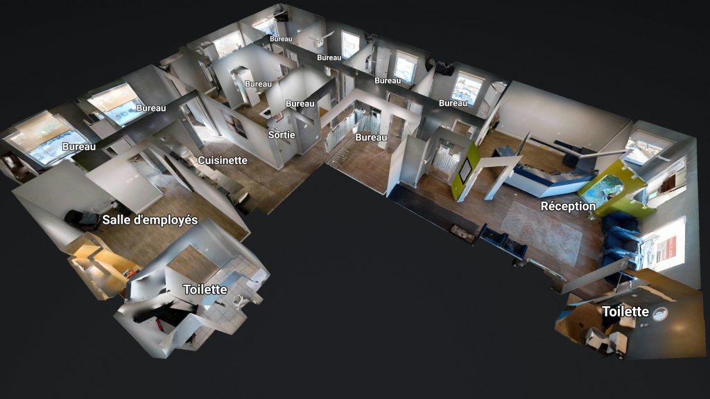 D’une superficie d’environ 2 236 p.c., le local est situé au 2e étage et comprend plusieurs salles de traitement fermés, une aire de réception accueillante, une cuisinette fonctionnelle ainsi que des salles d’eau. L’aménagement favorise une bonne circulation et une séparation efficace des espaces de travail, tout en bénéficiant d’une belle luminosité naturelle grâce aux grandes fenêtres.