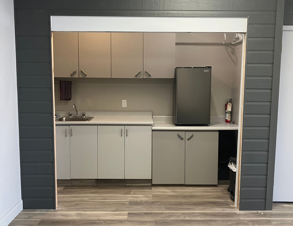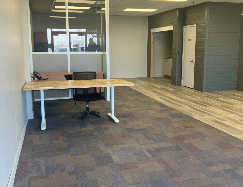 Le local comprend une salle de bain, une cuisinette et deux bureaux fermés séparés par un muret de verre. L’espace est lumineux et fonctionnel, idéal pour bureaux professionnels, services ou petite entreprise.