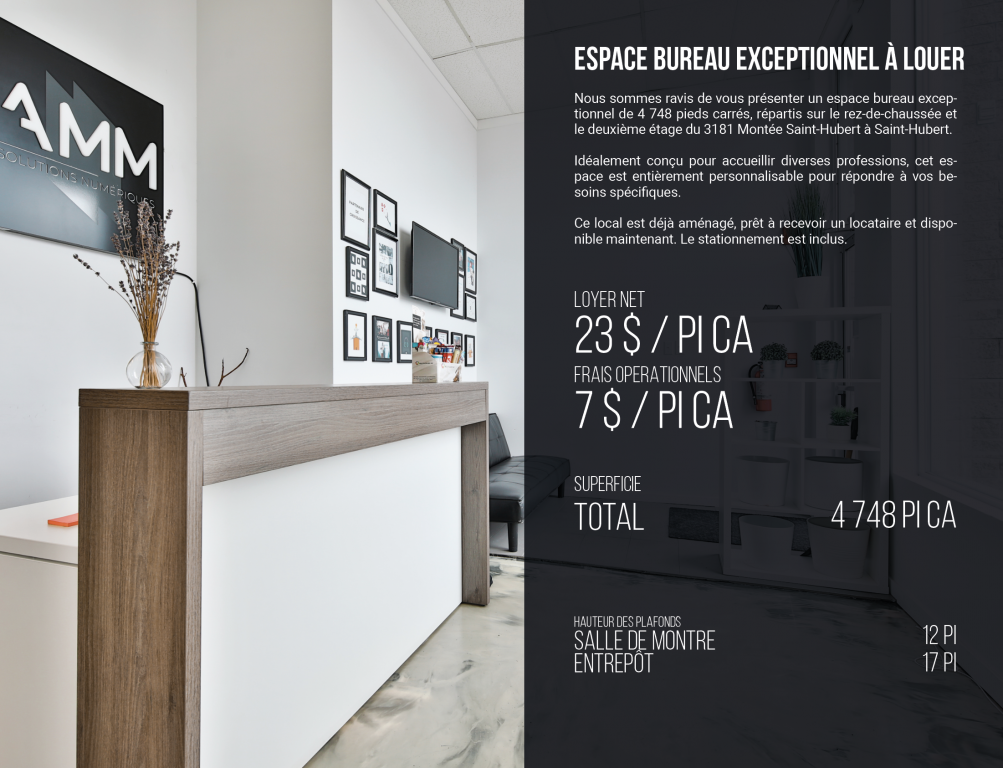 We are pleased to present an exceptional 4,748 square foot office space, spread over the ground floor and second floor at 3181 Montée Saint-Hubert in Saint-Hubert.