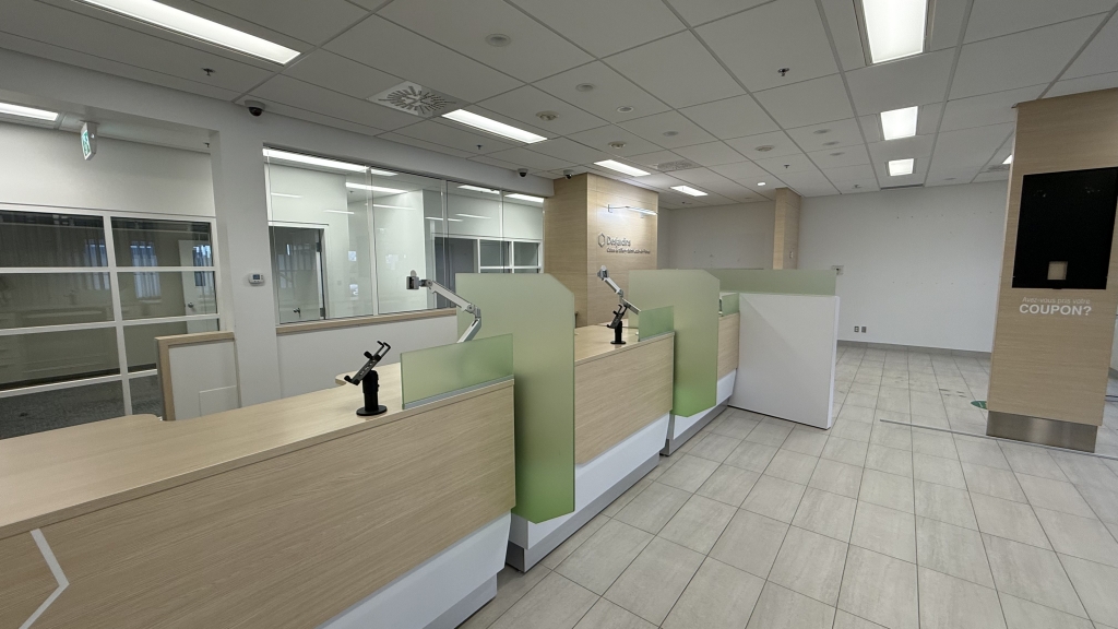 Occupé auparavant par une institution financière, le local bénéficie d’un aménagement pensé pour l’accueil du public, la sécurité et l’efficacité des opérations. On y retrouve un hall d’entrée spacieux, des bureaux fermés, des zones à aire ouverte modulables et une salle de réunion. La fenestration abondante en façade assure une luminosité naturelle constante, tout en offrant une excellente visibilité sur l’un des axes les plus passants de la ville.