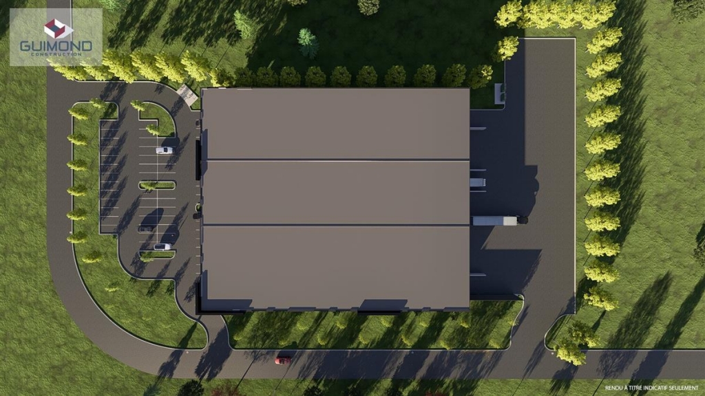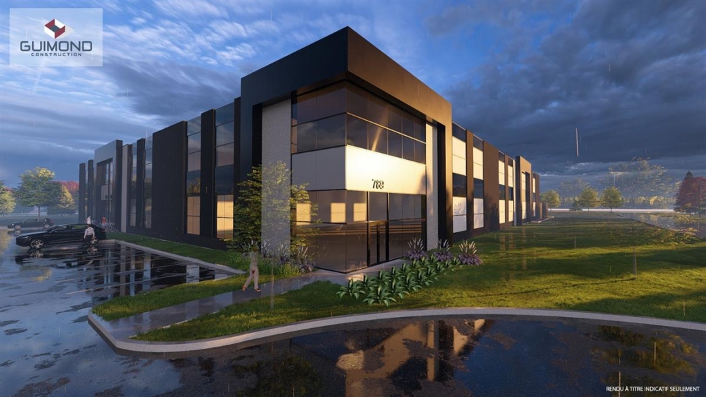 Industrial condo for rent of +/- 47,832 sq.ft., including +/- 42,214 sq.ft. on the ground floor and +/- 5,618 sq.ft. on the upper floor. Includes 6 loading docks, 3 ground-level doors (14x14), clear height of 28 feet and 60 shared parking spaces. Project to be built by Guimond Construction. Close to Highway 640. Project developed by Twinstone.